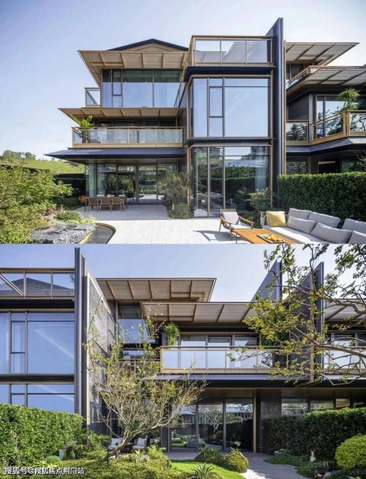 在立面打造上,提取“宋画”中的线条感,提取歇山顶样式,转译形成深远的挑檐,在视觉效果上给人以棱角分明、结构清晰之感,整体呈现一种清雅内敛的当代气质,大尺度巨幕玻璃窗镶嵌金色铝线条,如画框一般,攫住窗外的每一寸风景,让建筑隐于自然