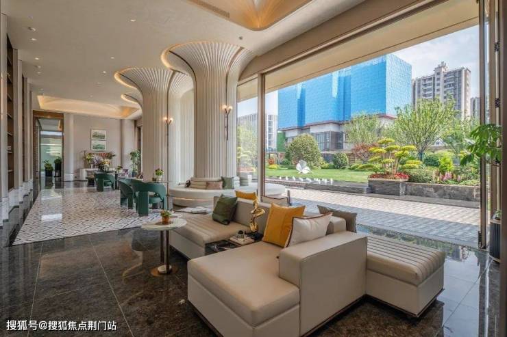 与这两年流行的“阔绰”门头相比,这座鎏金门头最大的亮点是通透——不仅顶部有一个圆形的镂空,偏置的大堂也为风景让了路,正前方没有任何遮挡,反而把最精彩的立体花园化作一幅动态图景,点缀了整条街道。
