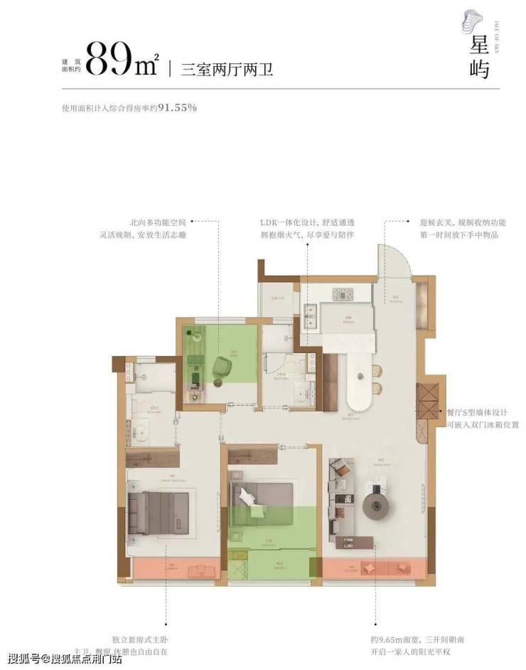 建面约89-104m²的三房、建面约115-132m²的四房,最高实际得房率达到100%,是目前杭州得房率最高的新盘之一!