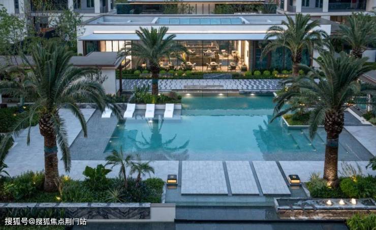 池畔栽种6棵武林壹号同款的加拿利海枣树阵,每棵直径都超50公分。风吹叶动,摇曳着浓烈奢华感。