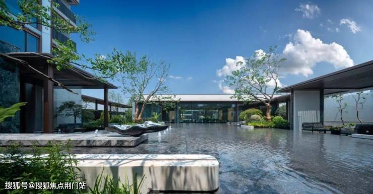 你甚至数不清,它究竟藏了多少重水的章法:大门前有“聚水生财”的雕塑喷泉,主入口有数米高的石墙瀑布。穿过风雨连廊,漂浮着约430㎡镜面水院。