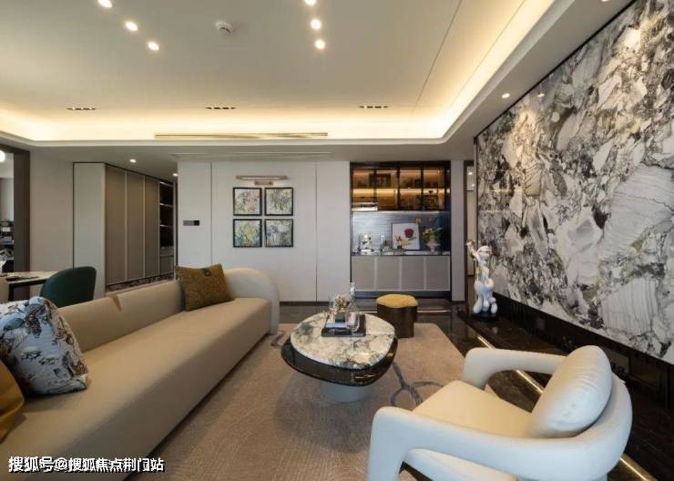 最后,是它藏在细节里的“美商”。全屋无主灯设计+弧形吊顶,客厅和主卧做了“双背景墙”。玄关柜、主卧衣柜全是交标,用上了编织纹皮革+冷翡翠岩板。