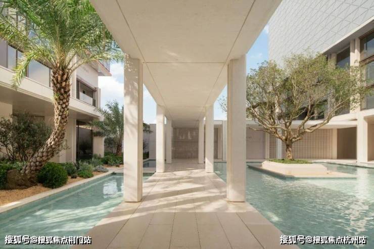 为此他们反复调试了水院底部的瓷砖颜色,以及水的深度,让它与纯色系的石材柱廊、立面,彼此呼应。同时,整个水系也用了和泳池类似的净水系统,不光要在销售阶段保持纯净,今后交付了,同样要打理得纯净透亮。