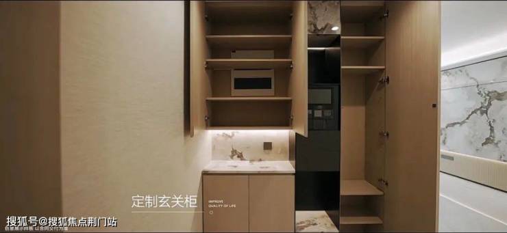 一梯两户下,入户是玄关,做了定制玄关柜,体面归家。这个玄关柜的收纳能力很大,挂衣区、行李收纳位、岩板置物台。