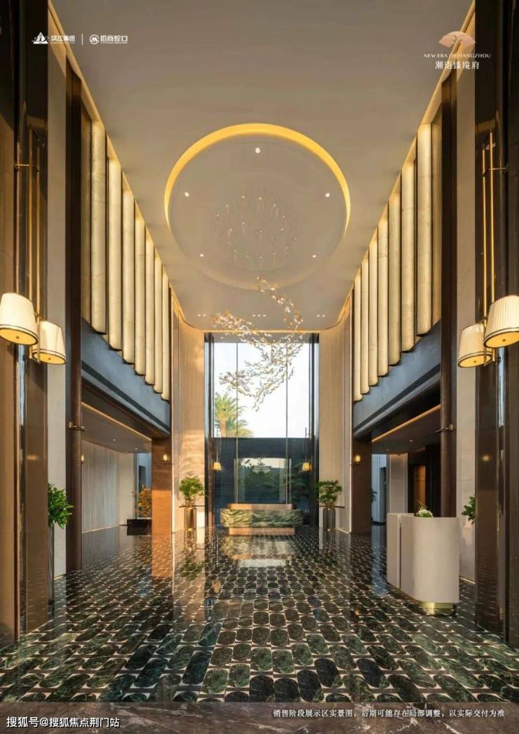 高层立面用上了大面积铝板+玻璃相结合石材、涂料为辅,斜切线条和顶部“凤冠飞檐”造型,阳光下泛着暖金色,比起涂料外立面,潮语臻境府的质感要高级不少。