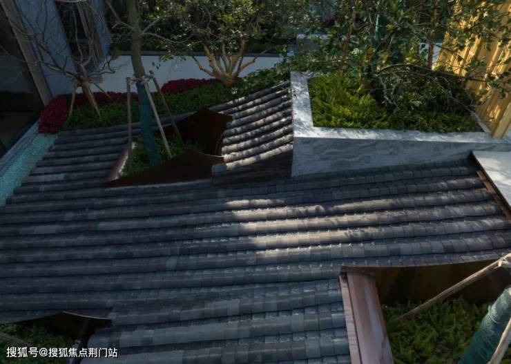 最别出心裁的是,戏水池南面还精心构筑了一座“瓦当流水”:一片片青瓦错落叠交,勾勒出一排古色韵深的“屋顶”。