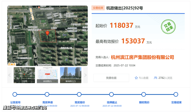 2025年7月22日,杭州滨江房产集团股份有限公司(滨江房产)以总价153037万元竞得杭州市余杭区良渚东单元YH030304-08地块,成交楼面价为17472元/㎡,溢价率为29.7%。