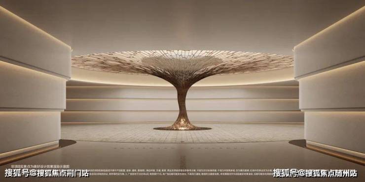 负一层多功能会所空间和中央车站相连接,以一颗造价百万的艺术造型的“黄金树”作为通往地下会所的空间过渡,与地上天光云廊的归家乔木相倒映,形成地面与地下的双归家仪式感与尊贵感。