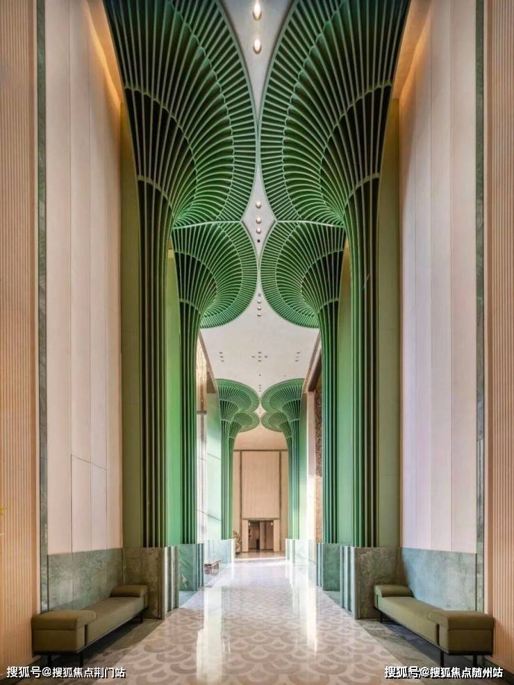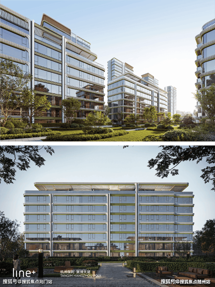 保利·奥博天珺的建筑外立面,依然是非常杭州的表达。镶嵌在繁复线条中的绿色陶板,用造价昂贵的曲线,刻画出了龙井春芽的神韵。