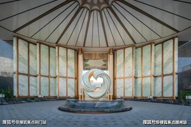 比如约56x11.5米的超尺度门庭,顶部以杭州折扇为造型灵感,寓意“藏风聚气”;四周还有12片巴西进口的百达翡绿奢石雕琢的玉石屏风;中间还有约9.6x5.3米的巨幅铜门,是由非遗传承人朱炳仁手工锻打,再现钱塘潮涌的磅礴气场。