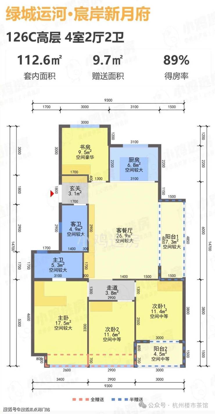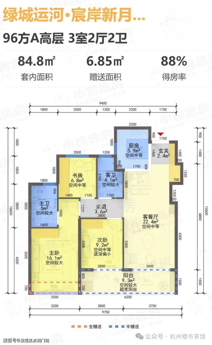 我们先来看看绿城&运河·宸岸新月的户型。它的面积有约96m²、110m²和126m²总共3个户型,3个户型样板房都做了,非常适合主城刚需。