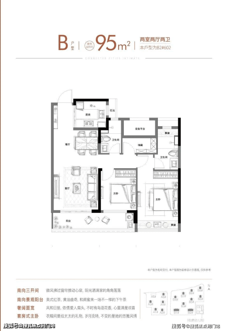 项目此次加推B区B5、B7幢,紧邻戏水池,位置很不错,主力户型建面约95㎡,设计也可圈可点。