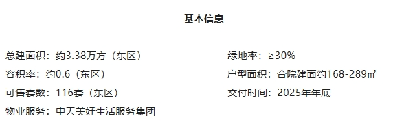 项目整盘总占地142亩,共分为三期开发,项目一期重点打造116套宋韵合院。一期合院单独计容积率约0.6,建筑面积168㎡-289㎡,主力户型为207㎡,花园面积在70㎡-300㎡不等,每套不计面积的露台约40㎡。