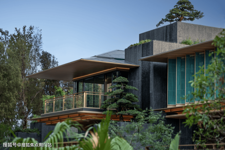 在立面打造上,樾青岚提炼飞檐、斗拱、引檐、直棂窗等宋代建筑细节,融揉现代审美工艺,重塑东方的当代表达;提取宋画中的线条感,通过局部铝线条的运用,融合巨幕灰蓝色玻璃,让建筑隐于自然,如画框一般,呈映天光云影。