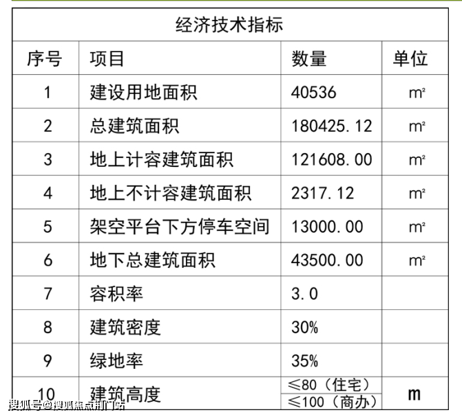 地块建设用地面积40536㎡,总建筑面积180425.12㎡,其中地上计容建筑面积121608㎡,地上不计容建筑面积2317.12㎡,架空层平台下方停车空间13000㎡,地下总建筑面积43500㎡,容积率3.0,建筑密度30%,绿地率35%,住宅建筑高度≤80米,商办建筑高度≤100米。
