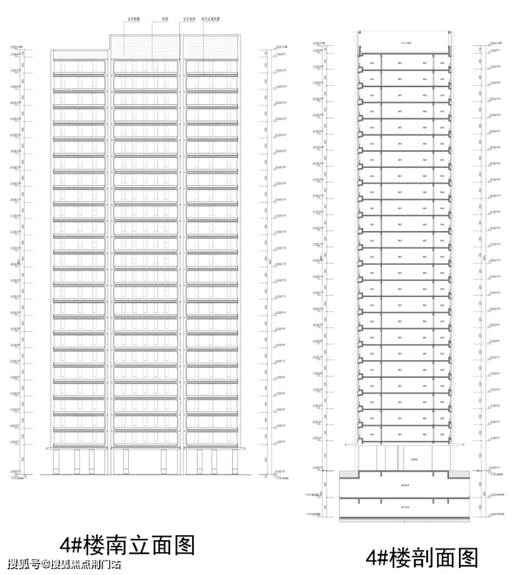 地块规划1幢16F、2幢17F及6幢25F共计9幢住宅,规划1幢22F商业商务楼及配套2F商业裙房。4#住宅地下车库层层高3.6米,地上架空车库层高4.9米,一层架空层层高5.5米,住宅标准层层高3米。外立面玻璃+金色铝板+银色金属线脚。