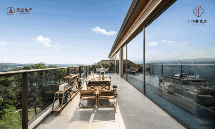 下叠庭院内,通透的大面积玻璃立面,结合檐下灰空间,形成开阔的空间感受;上叠超大面积露台打造“空中庭院”,使居住者于日常之中,体验到宋代取景自然、疏朗秀丽的园林之美。