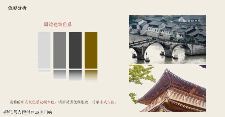 杭州古称钱塘,为南宋都城,宋朝在文化艺术领域的成就登峰造极,无论是在文学、绘画、建筑方面都有了质的飞跃,起到了承上启下的特殊地位。项目整体遵循宋代江南水乡的古城肌理,展现深宅贵府的隐奢调性,营造出“居山水、观天地”的空间意境。