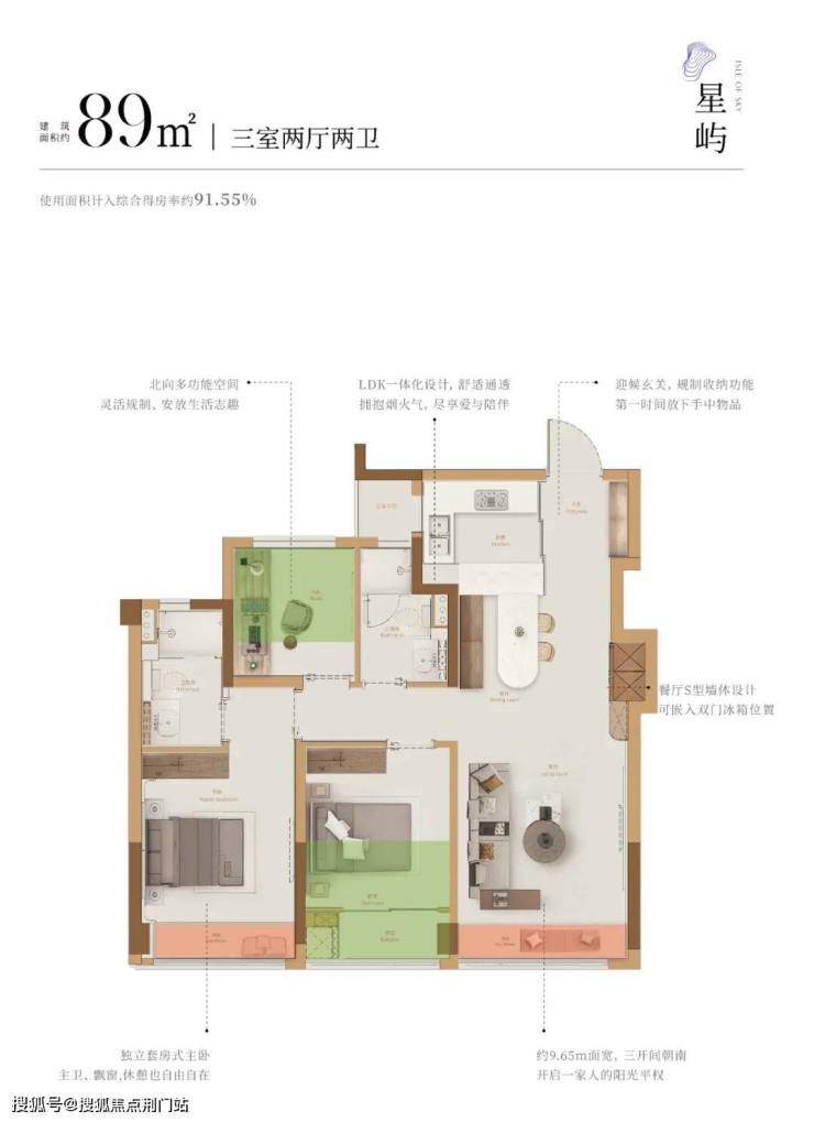 杭州楼市久违的89㎡三房两厅两卫户型,终于又回归市场。沐芳洲建面约89㎡户型,得房率约91%,实际使用面积相当于之前的95方户型。
