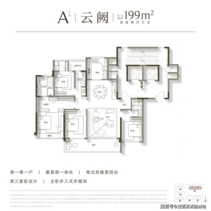 首先从空间上,199㎡做成类一梯一户,四房两厅三卫(三套房设计),南向面宽约16米,南向约8.5米景观大阳台,户户赠送储藏柜,兼顾了三代同堂的大家族生活。