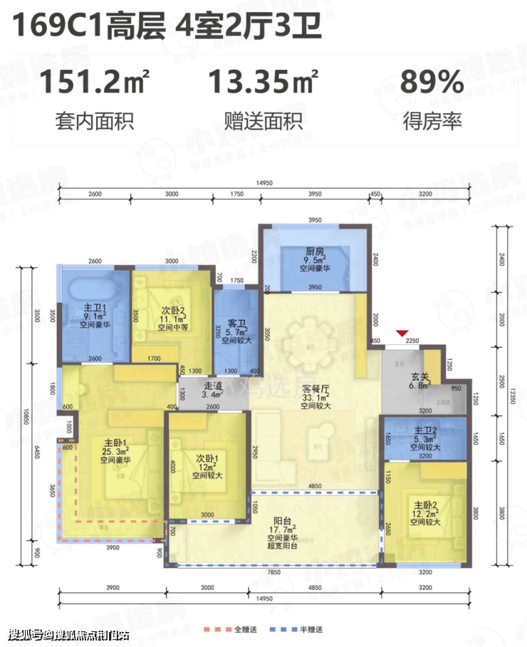 建面约169㎡C1-C2四室两厅三卫户型: