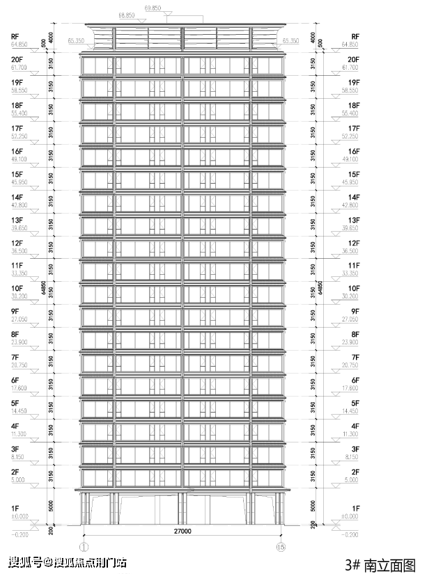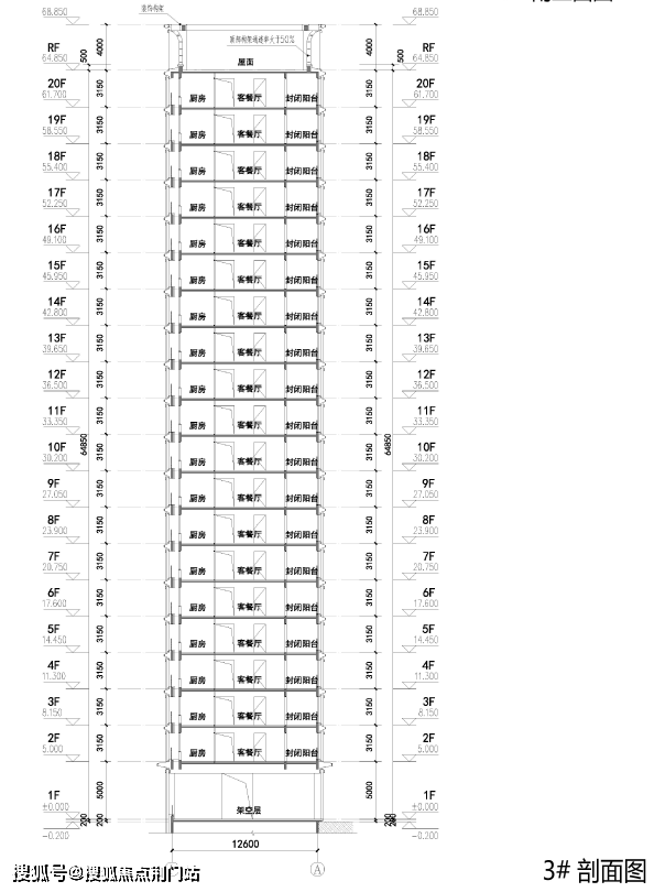地块总用地面积27534m²,总建筑面积104955.05m²,其中地上建筑面积87670.76m²,地上计容建筑面积68835m²,地上不计容建筑面积18835.76m²,地下建筑面积17284.29m²,建筑密度22%,容积率2.50,绿地率35.01%。以3#剖面为例,住宅架空层层高5米,标准层层高3.15米。地块规划4幢4F、1幢15F、4幢16F及3幢20F共计12幢住宅。