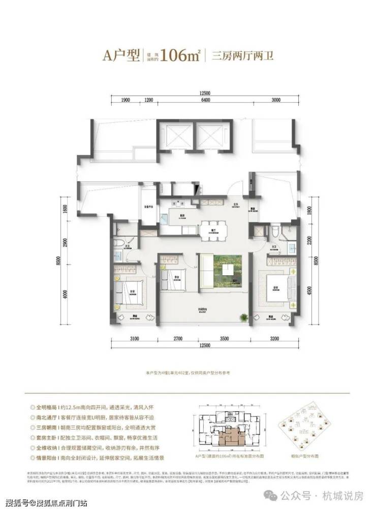 109方户型:三房两厅两卫,独立玄关,横厅边套,生活阳台+休闲阳台(全包),近13米采光