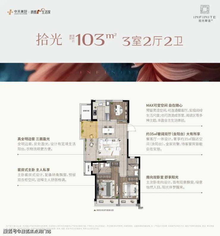 建面约103㎡的边套更是堪称神迹,将小户型的空间魔法玩到了极致。 客厅到阳台的地面、 天花直接拉通, 甚至两侧的墙垛都已隐身, 整个餐客厅面积达到约35㎡(含阳台),这可是140㎡以上大宅才有的空间感!