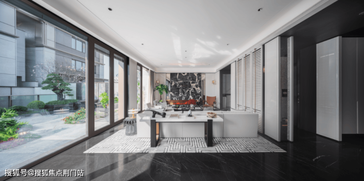 但郭庄是平面的,云启钱湾则是立体的,下沉式庭院仔细看有道不尽的精妙:石是“千年永存”的黑石皮,透着时光的千钧力道;水是泠然而下的飞瀑,比静水更有生命力。