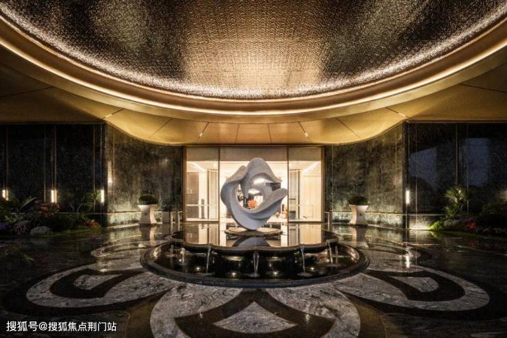 最具仪式感的应该是大门入口处:宽约35米、高约6.5米的寰宇云厅,如殿堂一般气势恢宏,两侧还有挪威蓝翡翠石材景墙对仗而立。