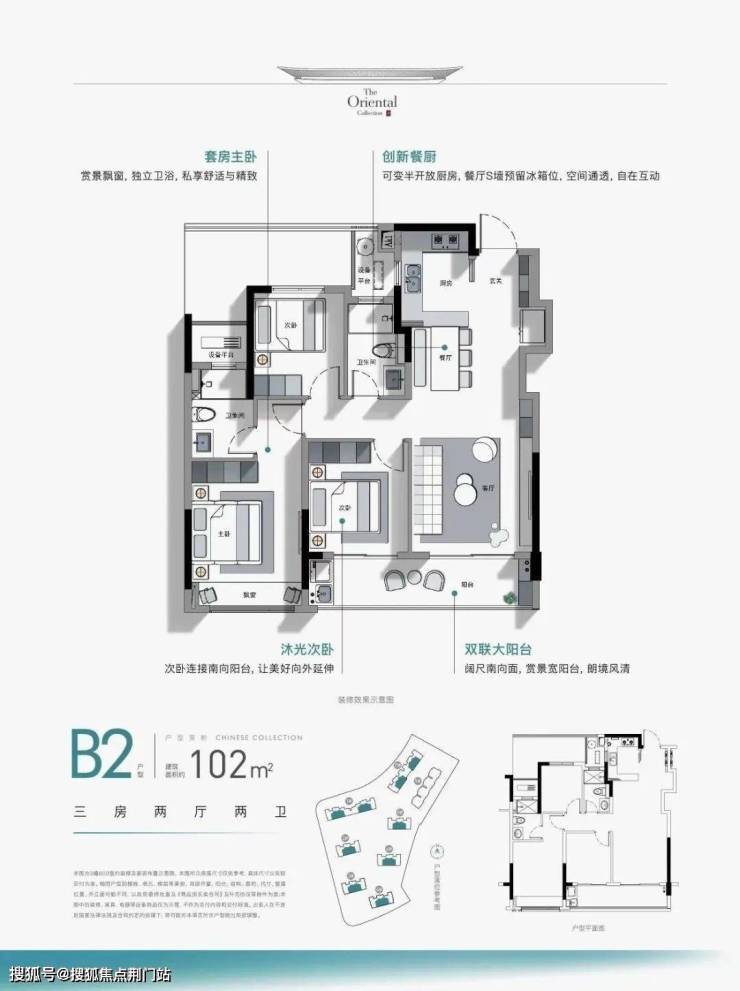 这套建面约102㎡的户型,采用了经典的三开间朝南布局,南向双联大阳台+南向飘窗,轻松满足采光、观景、晾晒等日常生活需求。