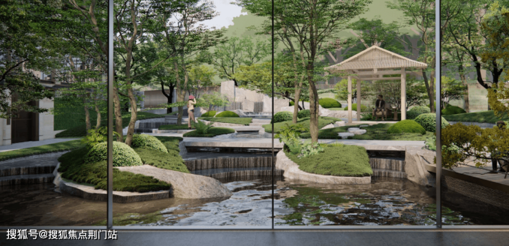 园区有下沉式庭院,庭院里面有层峦飞瀑,也有山涧溪流;假如你穿过连廊往园区走,溪林烟树、湖泊巷道……它们会带你一路穿过园区,你也会不停地跟树下的躺椅、泉边的亭廊不期而遇。绿城几乎是把已经修炼到炉火纯青的造园艺术,发挥到了园区的每一寸空间。