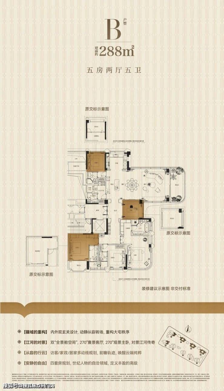户型特点:双阳台、四个套房带独立卫生间且三个房间朝南,考虑到了三代同堂和理想生活场景。
