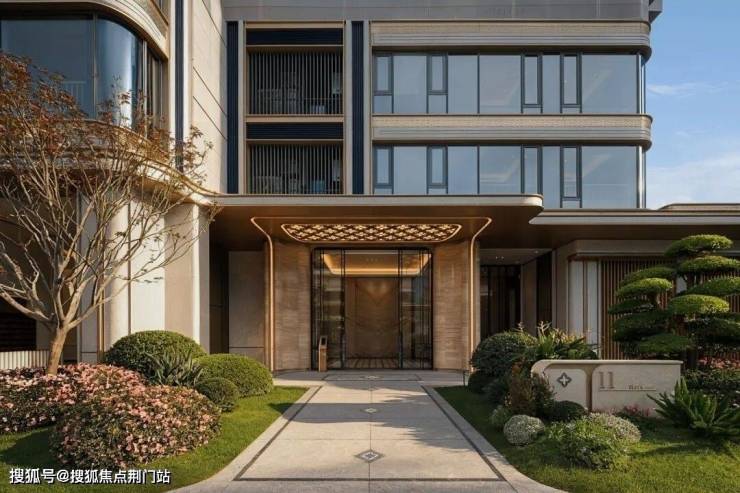 项目大门采用了杭州首个Art Nouveau的新艺术风格,入口横贯约80米,主楼约40米,大门由六扇曲面奢石墙体构成,采用大面积的维多利亚白奢石,端庄典雅、恢弘大气。加之大门顶部设计“金色流苏”装饰、曲线设计,工艺非常考究,当之无愧的城市级封面。
