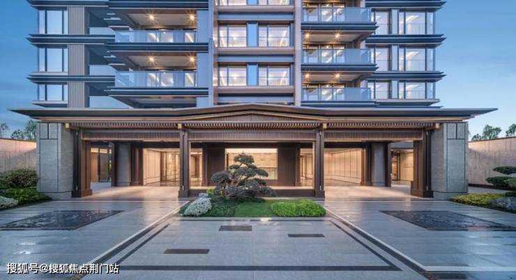 比如这一次的“建发式”大门一如既往,南北地块做了双大门设计,门头宽度达到约61米(含景墙)。入户做足了仪式感:重檐悬山式门楼、芝麻黑石材地雕、“鱼跃龙门”御道,两侧伫立着石狮、影壁、跌水、绿岛......还有两株精挑细选寓意“财富与健康”的罗汉松。