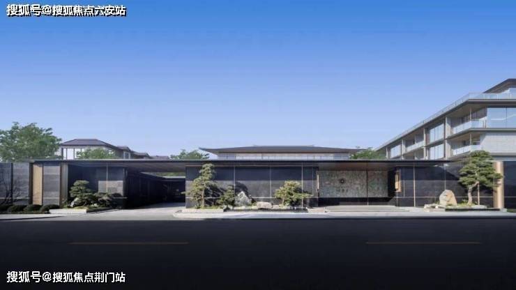 园林设计以中央山水景观轴为骨架,构建“一轴一带八景十巷”的多进式体验。入口处50米跨度大门以亚马逊黑奢石打造墙面,对景墙以亚马逊绿奢石镶嵌金石,刻绘项目Logo与六瓣梅花图腾,彰显沉静尊贵气质。