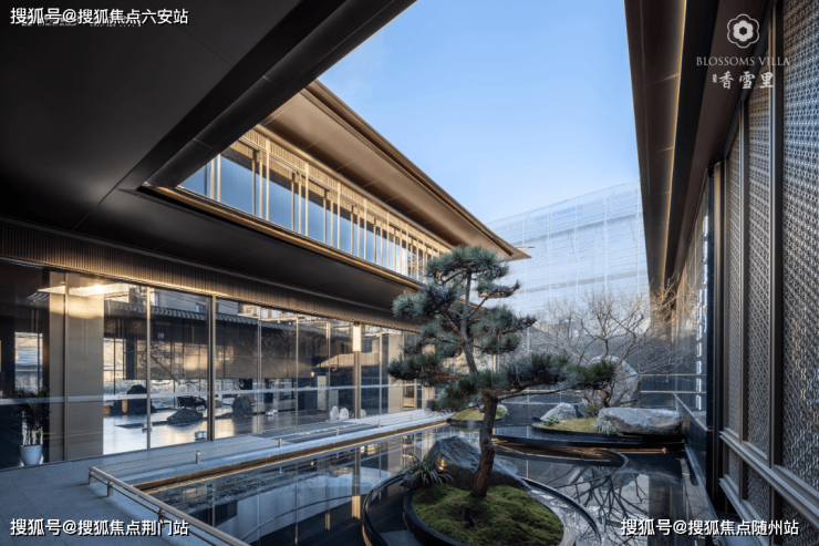 下沉庭院中,光影交织,潺潺流水映照婆娑树影,挺拔树姿注入向上生机,拉近建筑与自然的共鸣。镜面水庭倒映重檐飞角,玻璃幕墙将超山苍翠框成流动青绿画卷,与庭院景观相映成辉