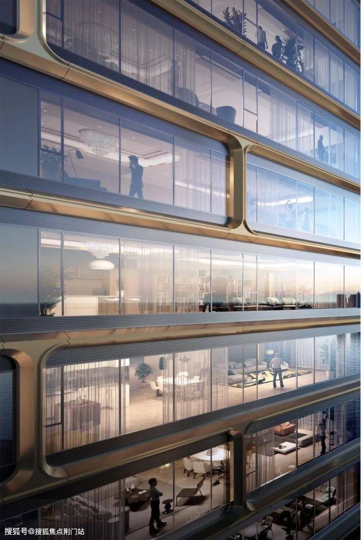竖向线条密度自下而上逐渐疏朗,下段收束密实,高区则逐步疏朗,对应基座稳重与高区通透。每一道曲面、每一条竖线都与户型功能和观景方向一一对应,形成如潮水般层层推进的动态界面。