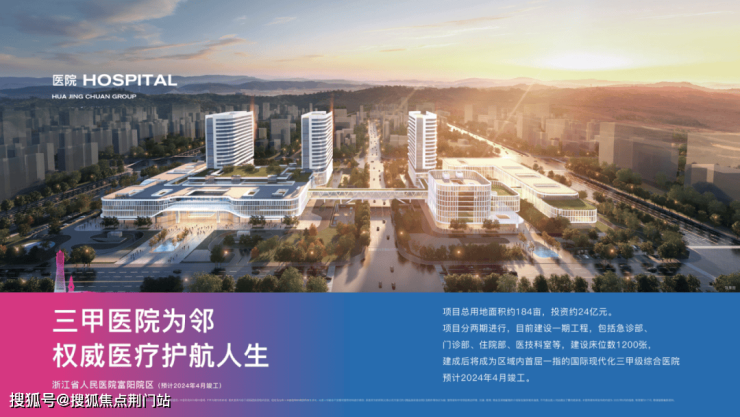 近揽浙江省人民医院富阳院区(在建),总用地面积176亩,总床位1200床,总建筑面积18万平方米,建设投资24亿元,融临床、科研、教学、培训、康复于一体,打造以智慧医疗为特色,与国际现代化医院接轨的三级甲等综合性医院、示范性区域医疗中心。该院已于2020年10月份开工,预计2024年4月份竣工。