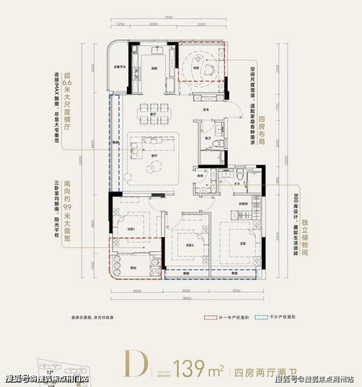 ❶高层建筑面积约139㎡户型,4房2厅2卫,含赠送得房率约92%。