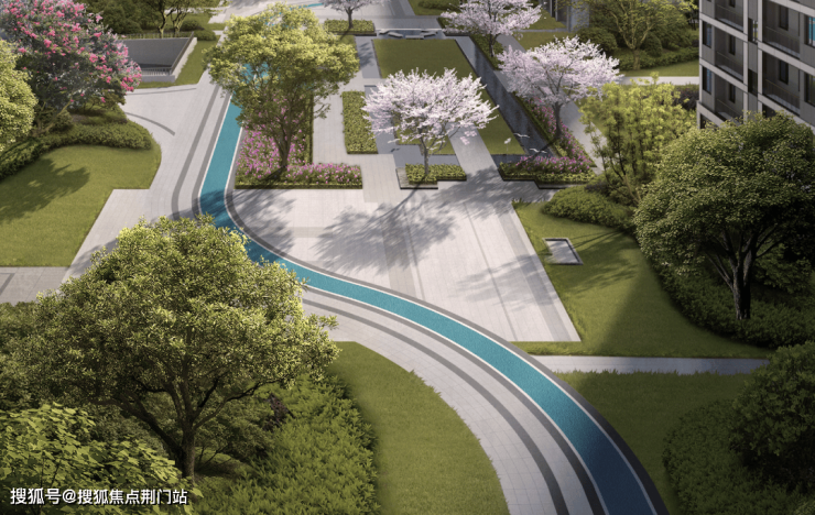 整体呈现三大景观组团,设置樱花大道,微风拂过,花瓣纷飞,如一出靓丽的“樱花大片”。同时,以多处水系造景,归家宛若游园,演绎别致度假风情。