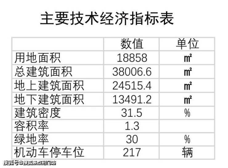 地块用地面积18858㎡,总建筑面积38006.6㎡,地上建筑面积24515.4㎡,地下建筑面积13491.2㎡,建筑密度31.5%,容积率1.3,绿地率30%,机动车停车位217辆。