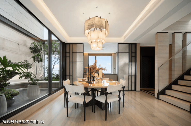 联排部分,绿城以巴黎卢浮宫玻璃金字塔为灵感,将金属雕花、石材立面与弧形玻璃幕墙进行解构重组,既保留了法式建筑的轴线感与仪式感,又通过大窗墙比(约65%)与270度环幕视野,将自然光影引入室内空间。
