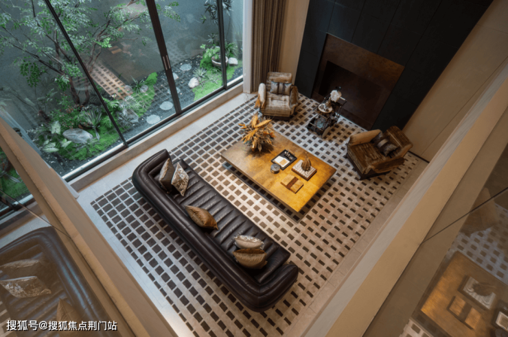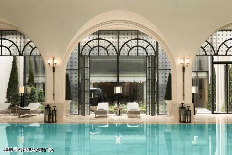 地下恒温泳池三面采光,顶部是15米玻璃天顶倒映着空中花园水景,泳池底部300万片马赛克拼出名画《睡莲》局部。两侧黑色铁艺屏风外是下沉庭院,让业主在游泳的同时也可看到外部的自然景观。