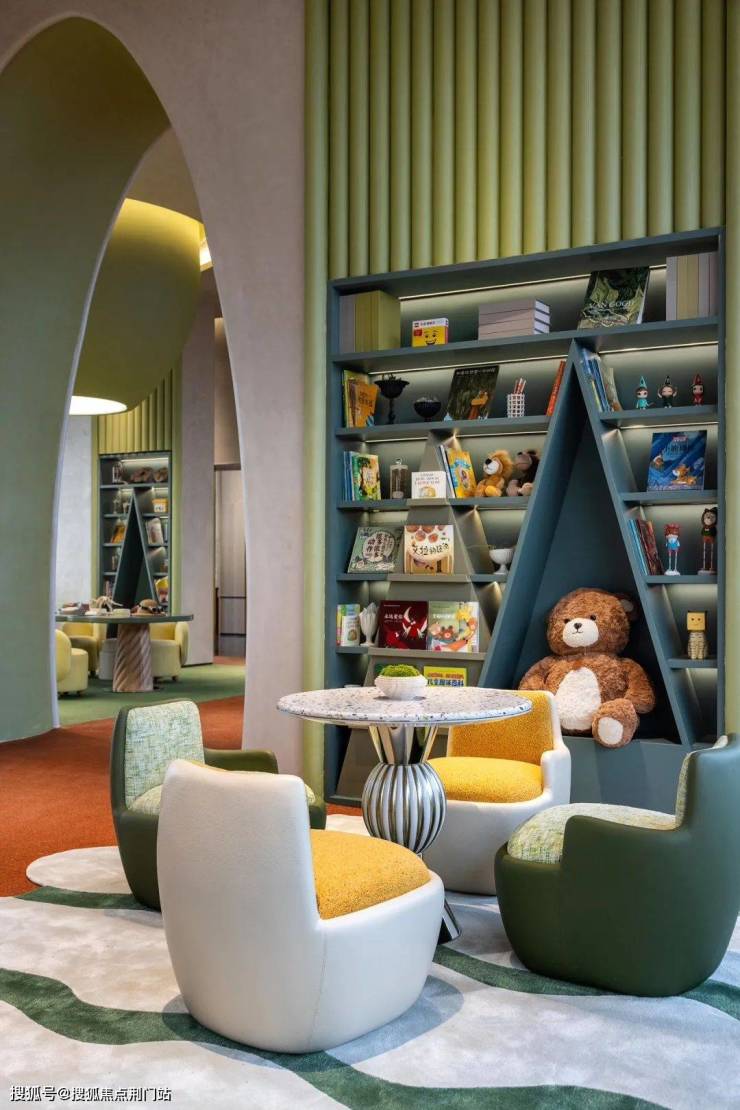 第二个,“向阳而生”。运用大面积的落地玻璃窗,让这个区域变的更加透亮。让绿意充分渗入,实现近距离、无遮挡观景视野。试想一下那个画面,当家长在外奔波一天,回家的路上,看到暖暖的光从玻璃盒子中映射,孩子笑的天真烂漫,回家的脚步也会不自觉的变得轻快了。