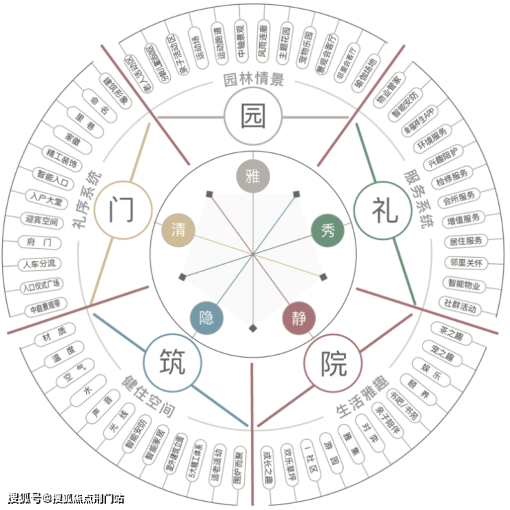 提炼东方建筑美学中的清、雅、秀、静、隐对应五音,形成“府系”产品的精神基因,而其在产品物理层面的表现则彰显出五个核心价值主张,即门—礼序系统、园—园林情景、礼—服务系统、院—生活雅趣、筑—健住空间: