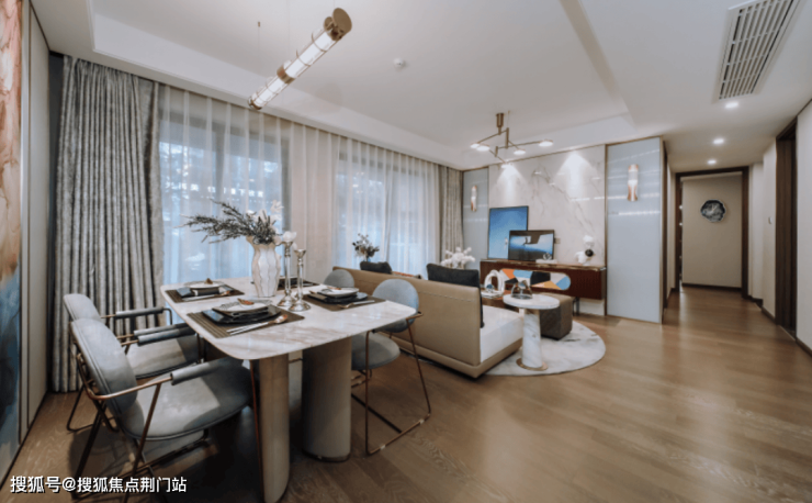 南向面宽做到了高达约9.7米。即便适逢寒秋、深冬,南侧的阳光依旧可以充分铺洒。此外,全明双卫、餐客厅一体,空间的阔敞感,一目了然。哪怕是客人到访,也会大为赞叹主人大家风度。