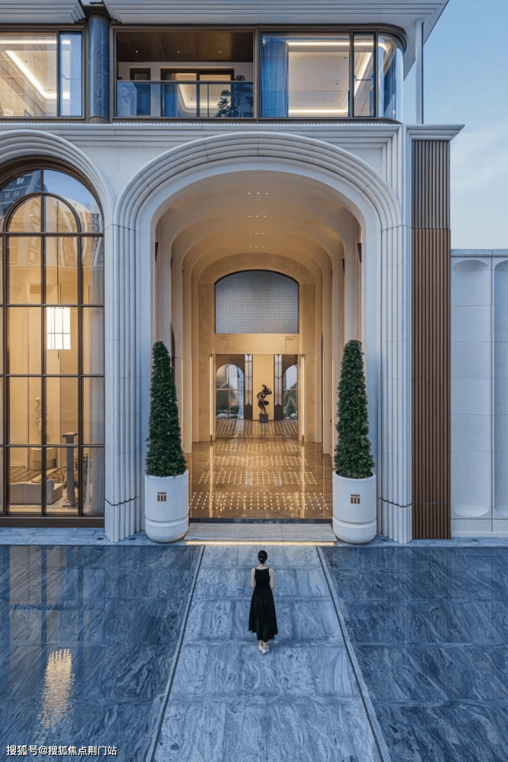 主入口两侧的景墙,通铺上了贝金米黄+宝格丽绿奢石。其间约540㎡的入口广场,镜面水景倒映着弧形景墙,神似一座水上宫殿。