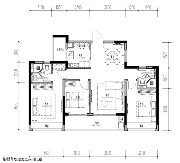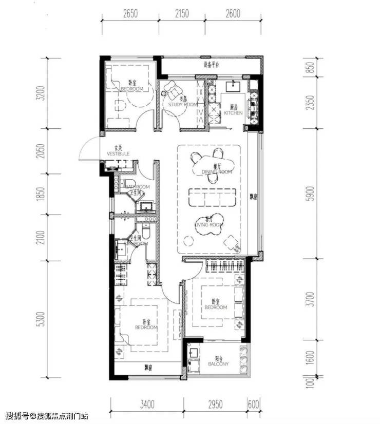 如果想要四房的户型,建面约108方也能满足,而且还是更多人喜欢的餐客厅一体大边厅设计,总价也不过200万左右。