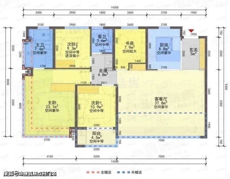 南向面宽约14.35m,南向双阳台,客厅阳台默认作为室内空间,次卧阳台可做生活阳台,能够满足晾晒家庭需求。